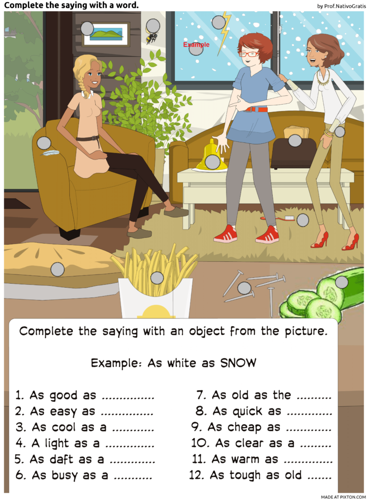 [widgets_on_pages id=”Advert”]Look at the picture and try to complete the AS …… AS expression / idiom. If it’s too difficult, look at the vocabulary below the image. Do it AS SOON AS POSSIBLE!